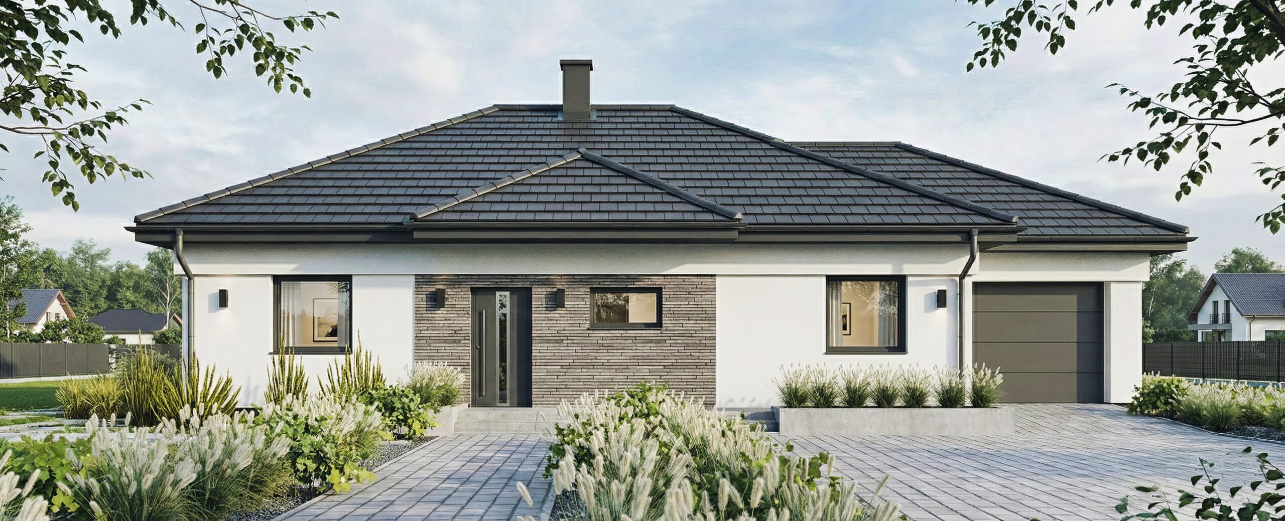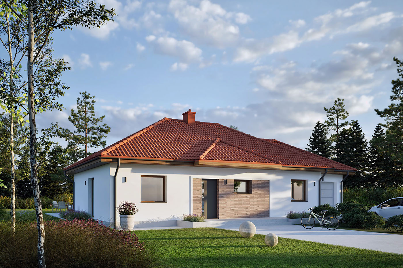 GW- Optymalny G1 to wersja naszego flagowego projektu powiększona o garaż jednostanowiskowy. GW Optymalny to projekt najczęściej wybierany przez klientów. Dom parterowy jednorodzinny o przemyślanej bryle, którą łatwo można dostosować – zarówno do stylu klasycznego jak i nowoczesnego – co obrazują nasze wizualizacje. W wersji z garażem jednostanowiskowym otrzymujesz idealnie dopasowany wymiarami garaż, który pomieści każdy standardowy samochód lub będzie służył jako dodatkowe pomieszczenie magazynowo gospodarcze. Jeżeli jesteś zainteresowany większym garażem koniecznie sprawdź wersję G2!